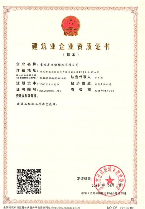重慶友杰鋼結構有限公司是一家承接提供各類鋼結構設計、鋼結構構件制作、鋼結構建筑工程安裝的專業化企業,公司位于重慶市江津區白沙工業園區內,擁有標準化廠房30000多平米,各類生產、施工設備齊全,高素質管理人才及專業工程技術人員60多名,職工600余人,是一家專業從事鋼結構建筑工程設計、制造、安裝為一體的股份制企業。現已具有鋼結構專業承包二級資質,并通過了建筑施工企業ISO9001質量體系、ISO14001環境管理體系和OHSAS18001職業健康體系“三體系”認證。    公司自成立以來,始終堅持以市場為導向,以科技創新為動力...
